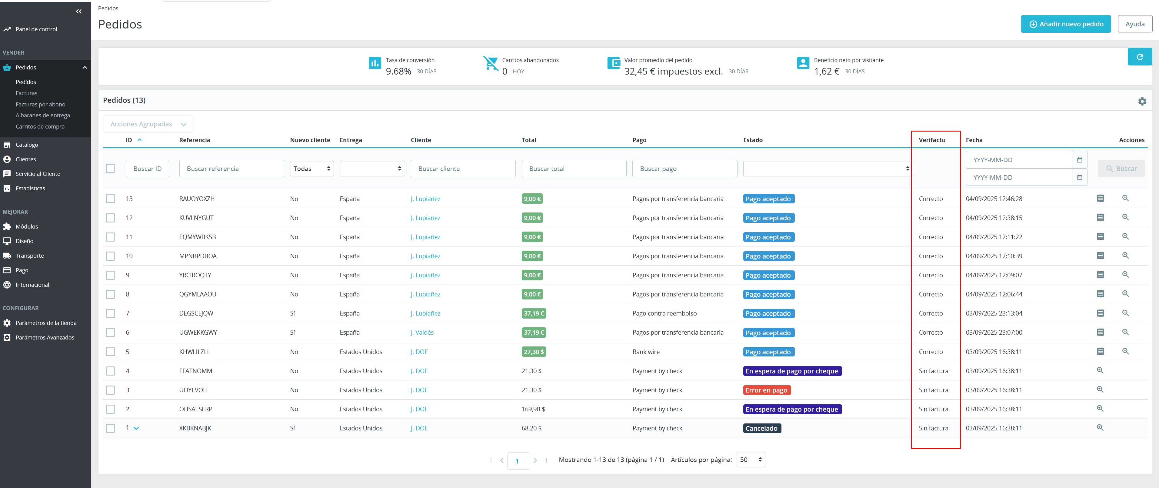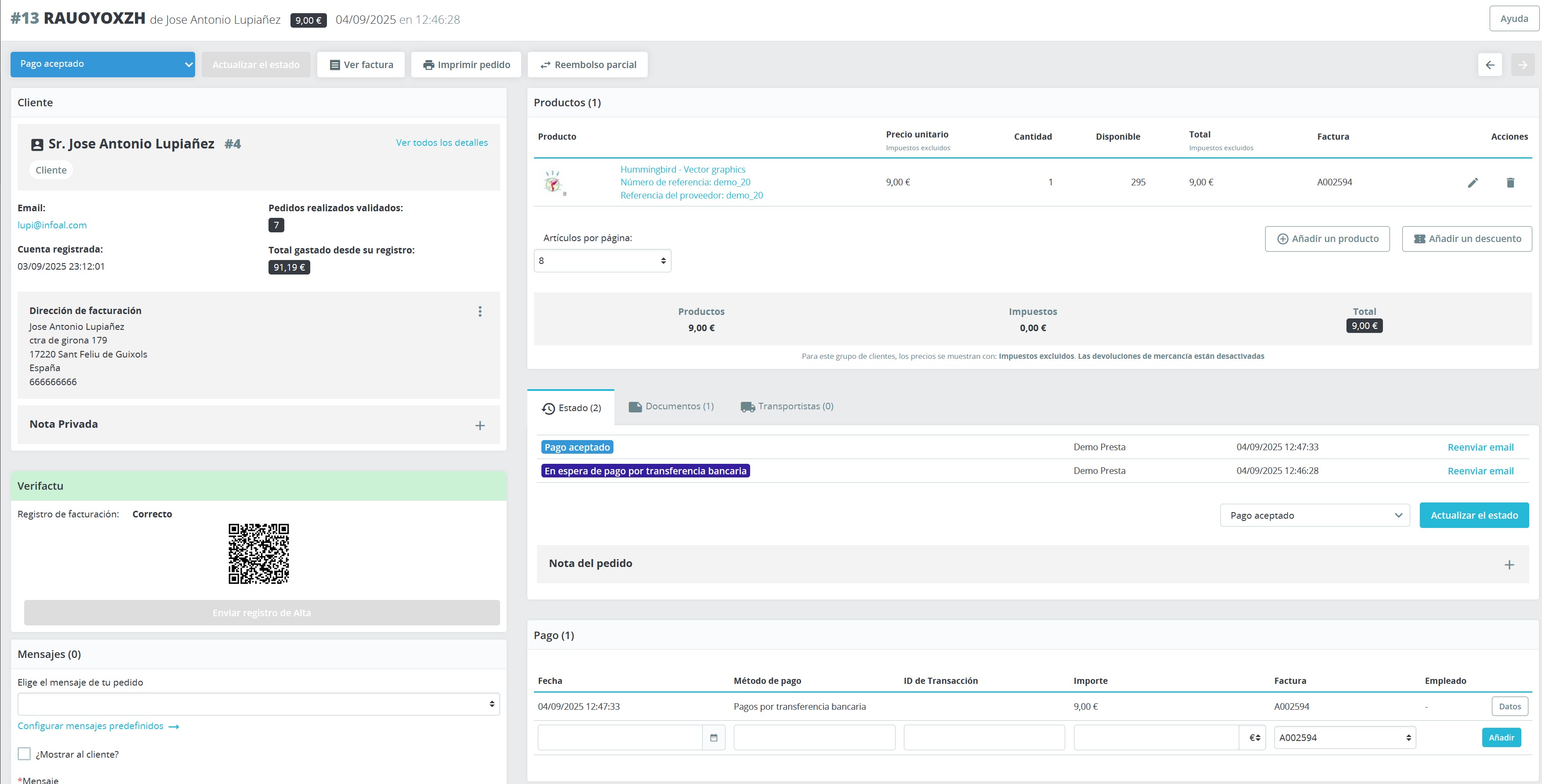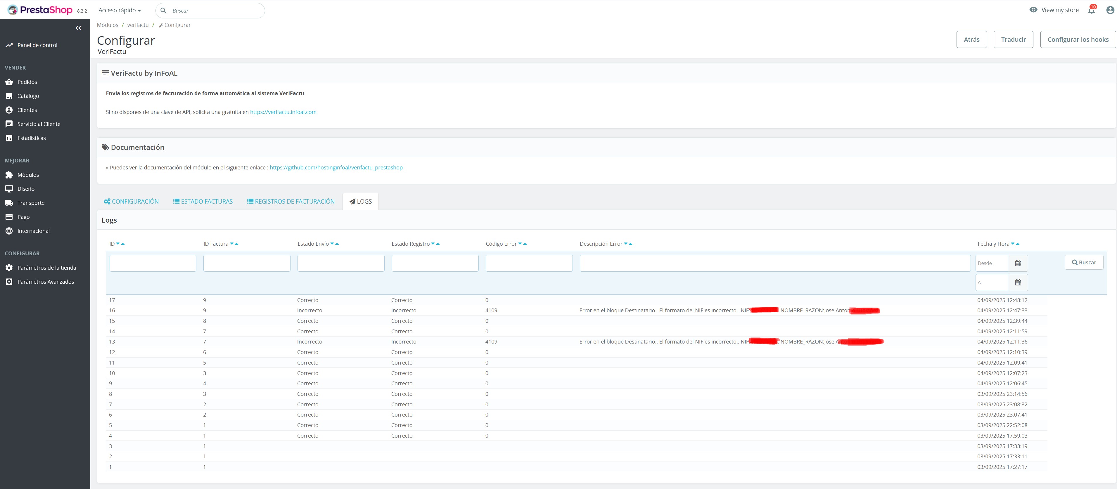 Todos los datos se transmiten a tu Prestashop, pero además puedes acceder a verifactu.infoal.com para consultar todas las facturas, el estado de las transmisiones, clientes, descargar los XMLs, ver los códigos QR y muchas funciones adicionales.