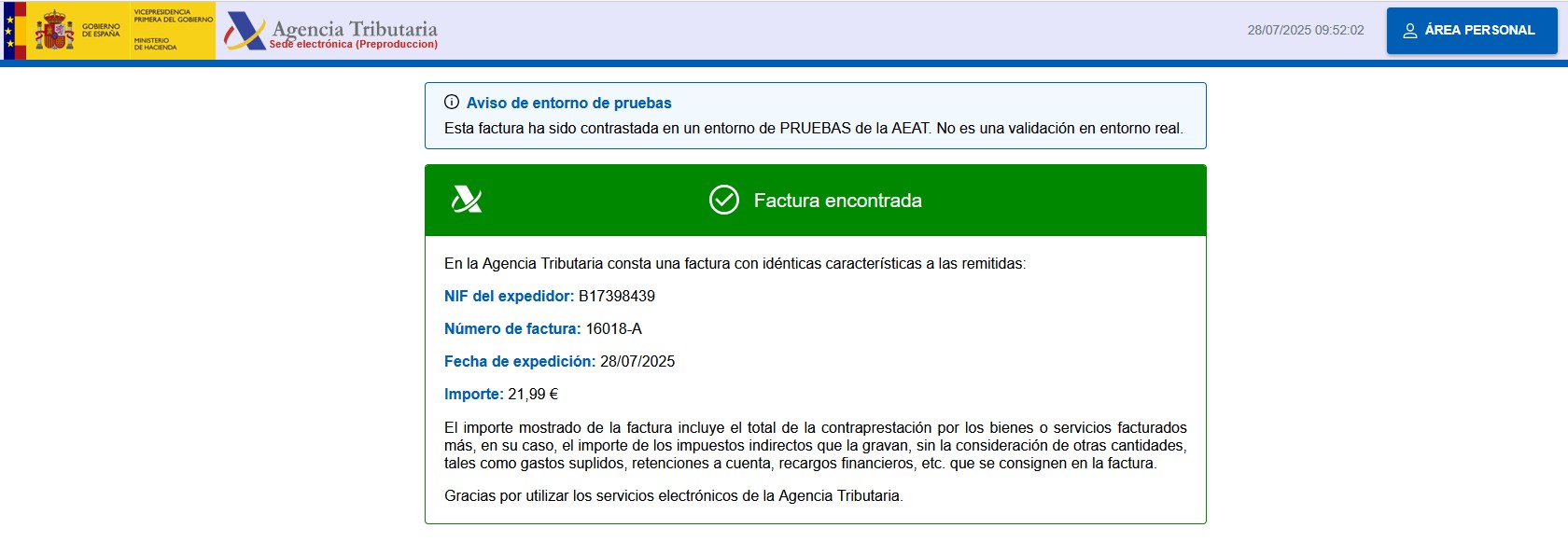 Las facturas contienen un código QR que permite su rápida verificación en la sede electrónica de la AEAT.